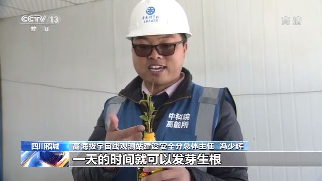 高海拔宇宙线观测站建设安装分总体主任 冯少辉:昨天在工地上石头缝里看到一棵青杨树我就带回来了,是一个很不起眼的小树苗,但一天的时间它就发芽生根,也代表了科研团队和参建单位在高原的一个精神,挑战高海拔,战胜不可能,我准备把它带到北京去,可以想到高原的生活,高原奋斗的时光。