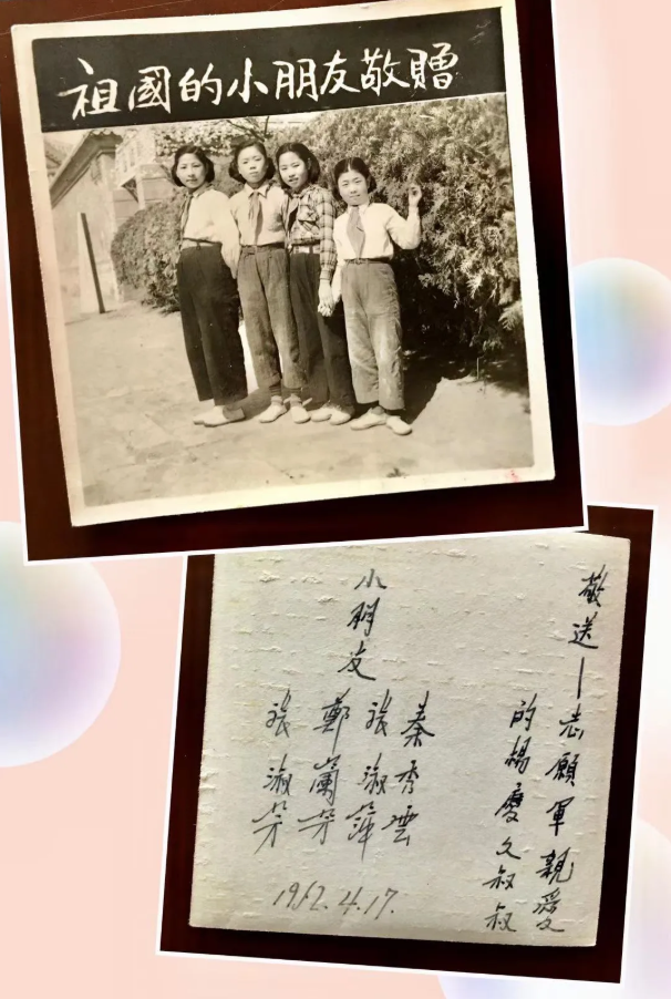 杨庆久老人的相册里一直珍藏着一张老照片,照片上是4个戴红领巾的小女孩。照片的最上面写着“祖国的小朋友敬赠”,照片的背后最右边写着“敬送志愿军亲爱的杨庆久叔叔”。左边依次写着4个小朋友的名字,分别是秦秀云、张淑萍、郑兰芳、张淑芳。时间显示为1952年4月17日。