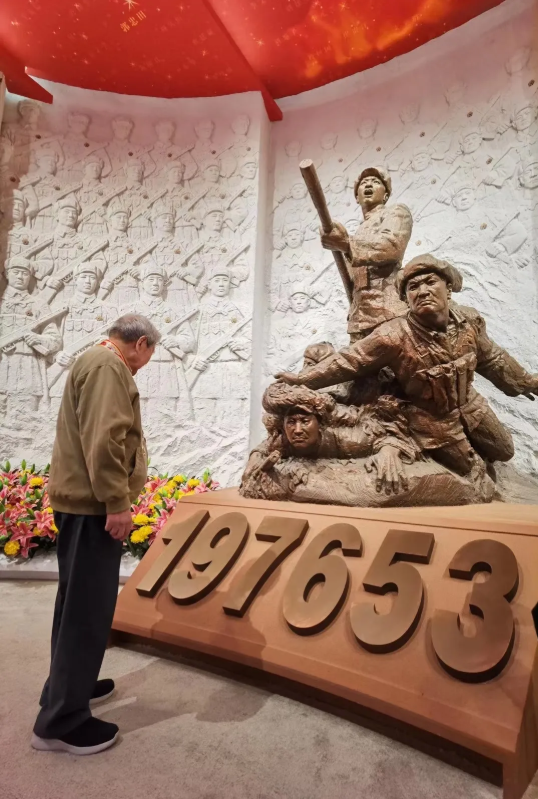 站在50军149师的红旗下,他高兴地看了半天舍不得走,走着走着就忍不住唱起志愿军军歌。每一幅照片,每一件纪念品,都让他仿佛又回到了硝烟滚滚的战场。有个雕像底下写着197653,是牺牲的烈士人数。老人看到以后伤心落泪,“牺牲的太多了”。
