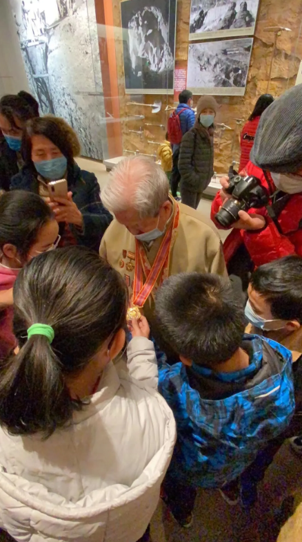 △孩子们围拢在杨庆久老人身边看纪念奖章