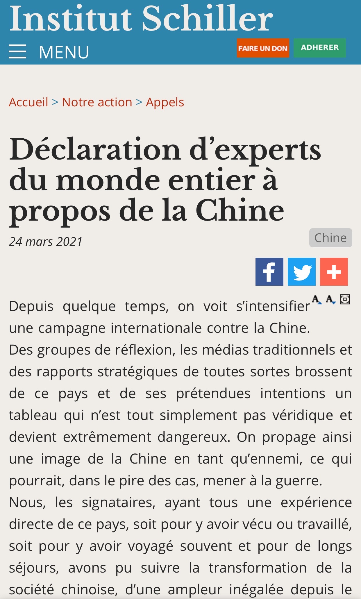 当地时间3月24日,法国席勒研究所在其官方网站发表了由(研究所)各国的专家学者联合签署的一份声援中国的声明。